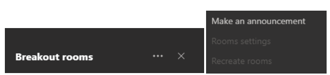 Voit luoda ryhmille ilmoituksia, kuten ”5 minuuttia kokousta jäljellä”, kun vähintään yksi pienryhmätiloista on avoinna. Napauta kolmea pistettä Breakout rooms:in jäljessä ja valitse Tee ilmoitus (Make an announcement). Kirjoita ilmoituksesi ja lähetä se. Ilmoitus näkyy erillisenä ilmoituksena ikkunan oikeassa alanurkassa, Keskustelut-ruudussa ja Bannerissa pienryhmätilan keskustelussa.