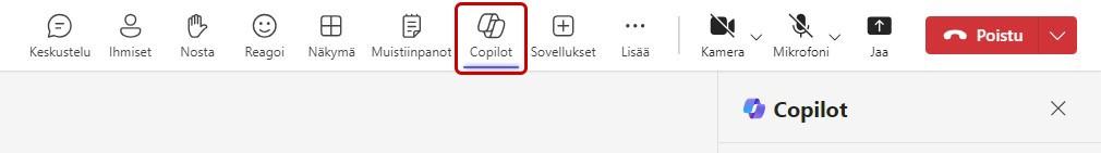 Copilotin käyttö Teams-kokouksien aikana on yksinkertaista ja sen saa käyttöön valitsemalla Teamsin ylävalikosta: