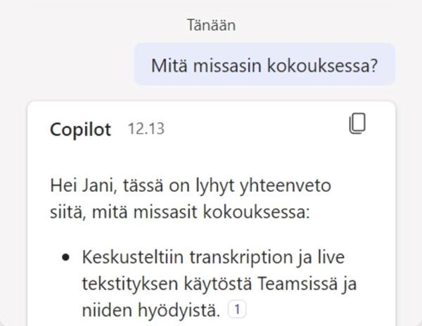 Copilotilta voit kysyä myös kokouksen jälkeen, mitä keskusteluissa päätettiin tai mistä puhuttiin. Tämä on erityisen kätevää, jos et ollut paikalla koko kokouksen ajan tai ollenkaan kokouksessa mukana.