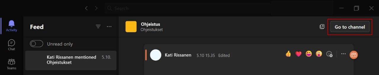 Saatuasi ilmoituksen lukemattomasta viestistä Activity (Toiminta) -osiossa, napsauta oikeassa yläkulmassa Go to channel (Siirry kanavaan). Voit lukea muita kanavassa olevia viestejä, eikä sinun tarvitse miettiä, missä kanavassa kyseinen viesti on.
