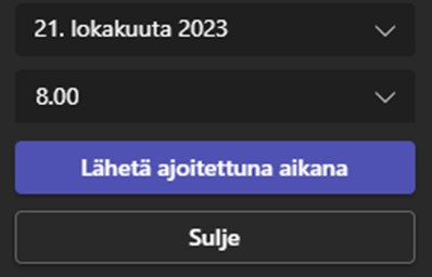 Voit ajastaa viestin kollegallesi lähtemään haluamaasi ajankohtaan. Tämä on erittäin kätevä ominaisuus esimerkiksi silloin, kun kollegasi työskentelee eri aikavyöhykkeellä tai vuorotyötä tekeville henkilöille. Voit ajastaa myös esimerkiksi raportin lähettämisen tiettyyn ajankohtaan.